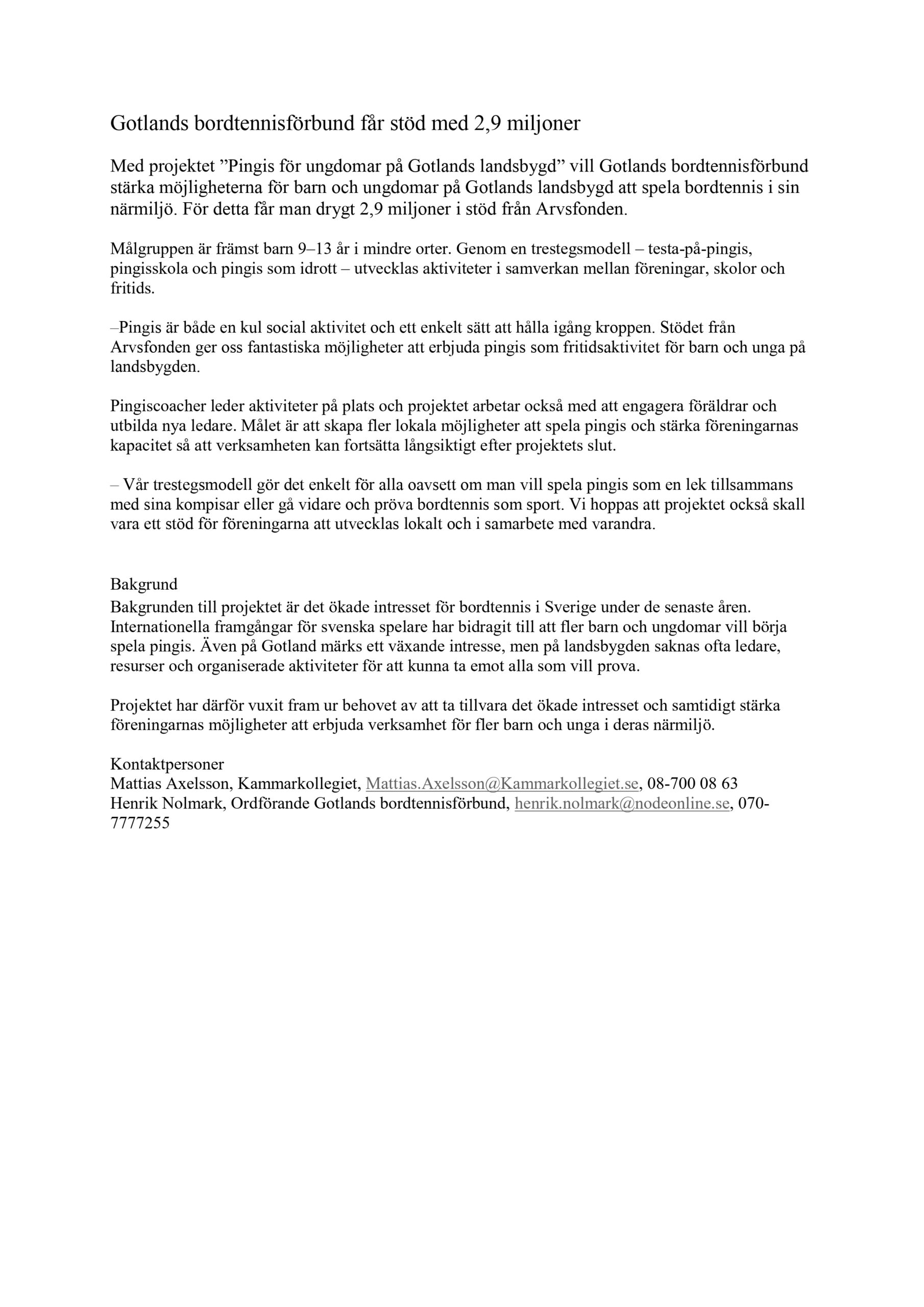Gotlands bordtennisförbund Allmänna arvsfonden 2026